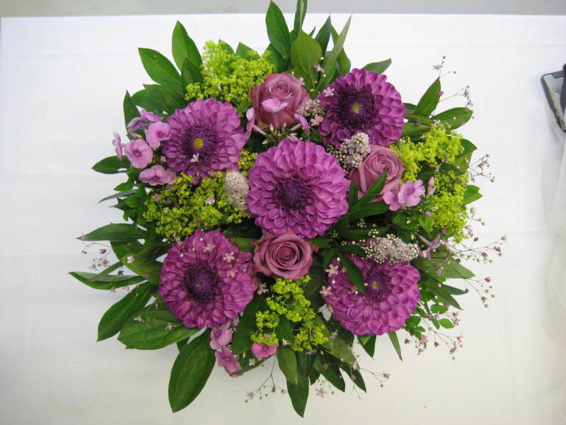 In diesem klassisch gebundenem Blumenarrangement sind enthalten:  5 Dahlien, 3 Rosen, Alchemilla, Phlox, Freilandschleierkraut und Sommerlaub